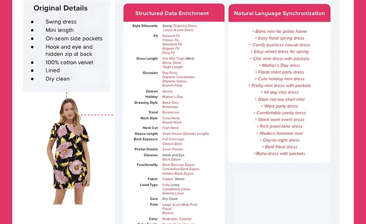 Products must first be found to be sold. Lily AI enriches both consumer-facing and non-consumer-facing product content, including core attributes, details, and descriptions, as well as metadata and schema markup.